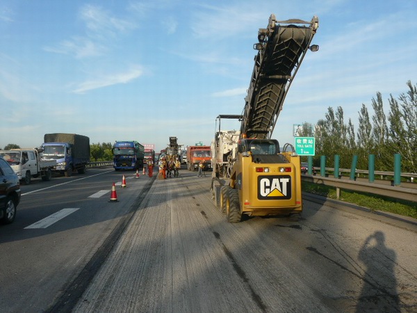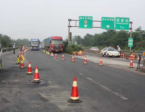 第二、要對(duì)施工過(guò)程中的實(shí)際工程數(shù)量、各工序之間的銜接點(diǎn)、工程的難點(diǎn)、工程進(jìn)度等與車輛有序通行可能產(chǎn)生的矛盾做好充分的準(zhǔn)備。對(duì)于本項(xiàng)目,主要問(wèn)題有三個(gè):其一是由于該路段交通量太大,所以無(wú)論是挖補(bǔ)工程還是罩面工程,都必須是白天安排施工作業(yè),夜間則要恢復(fù)道路雙向四車道通行;其二是出京方向K69--K98段無(wú)任何分流路線,需要考慮周密的交通管理措施;其三是通過(guò)實(shí)驗(yàn)和數(shù)據(jù)收集,準(zhǔn)確預(yù)判各類狀況,及早采取措施,避免各類意外情況發(fā)生。為切實(shí)做好本項(xiàng)工程,我們?cè)?span lang="EN-US">2009年10月、2010年10月和2011年7月在不同路段分別進(jìn)行了三次試驗(yàn)性施工。通過(guò)試驗(yàn)我們摸清了如下情況:1、正常通行時(shí)單車道能夠通過(guò)的最大交通量;2、施工過(guò)程中組織好車輛的有序通行至關(guān)重要,倘若有一輛車通行不暢進(jìn)而造成堵點(diǎn)就需要立即疏導(dǎo),否則就會(huì)迅速形成長(zhǎng)距離大面積的擁堵;3、壓車超過(guò)一定數(shù)量時(shí)需要暫停施工放行。通過(guò)模擬施工,我們制定了切合實(shí)際的應(yīng)急預(yù)案,為施工時(shí)及時(shí)有效地處置突發(fā)事件提供了極大地幫助。