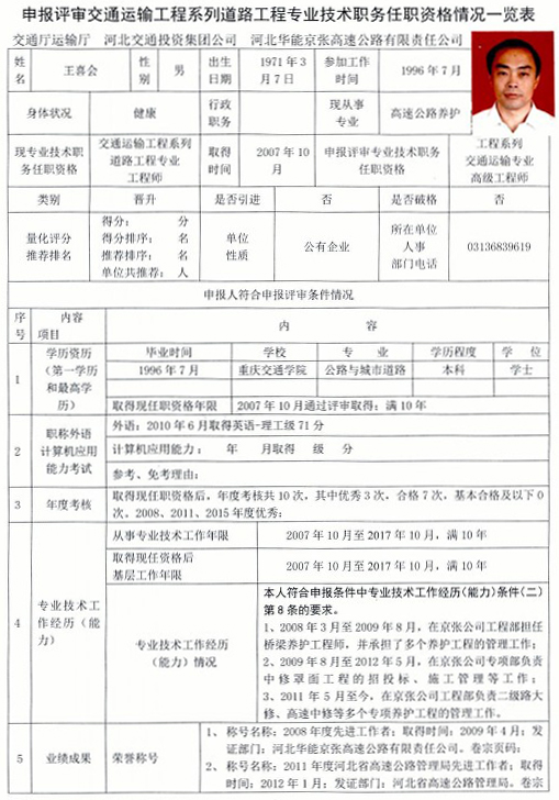 京張公司2017年度專業(yè)技術(shù)職稱申報公示(王喜會)