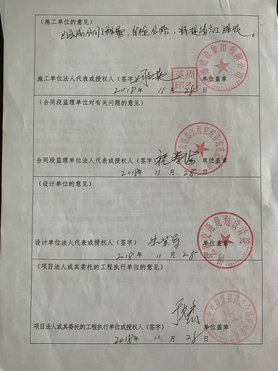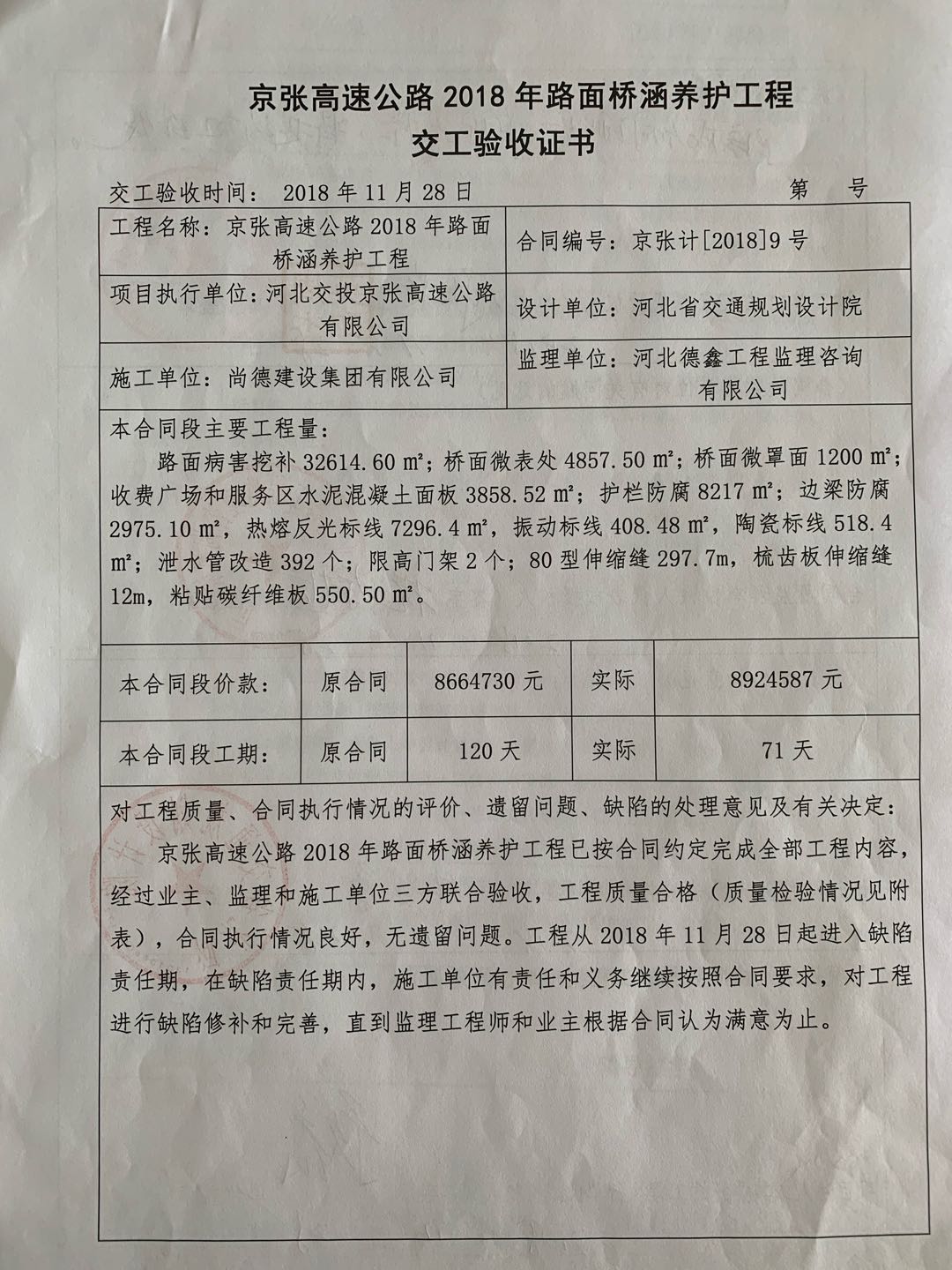 京張高速公路2018年路面橋涵養(yǎng)護(hù)工程交工驗(yàn)收證書(shū)